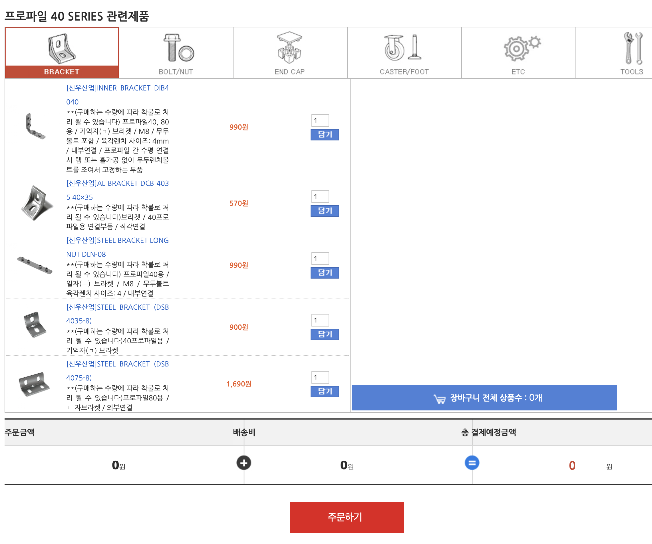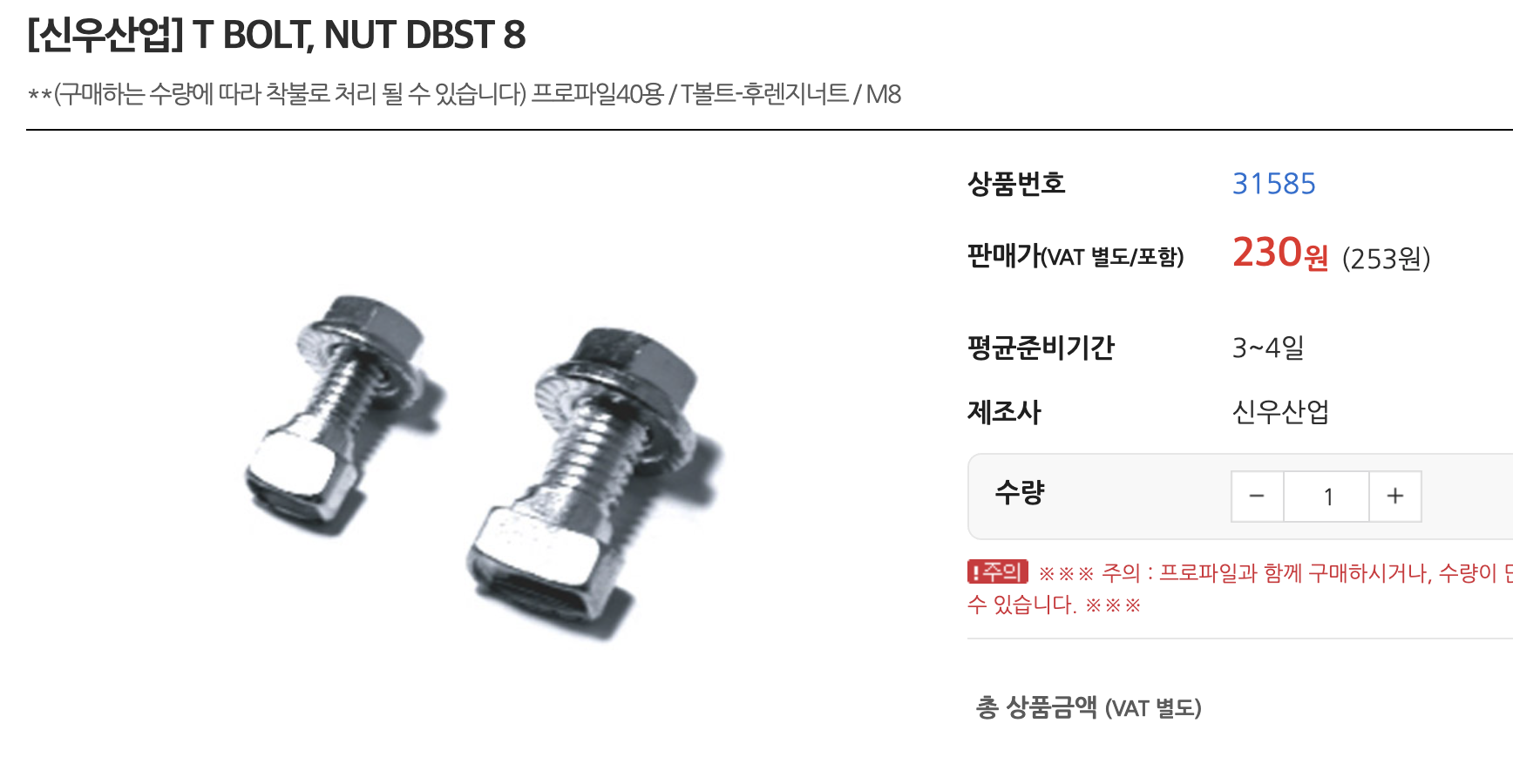 오른쪽에 있는거 기반으로 T slot profile 40x40짜리를 450mm로 5개 사기로 결정!