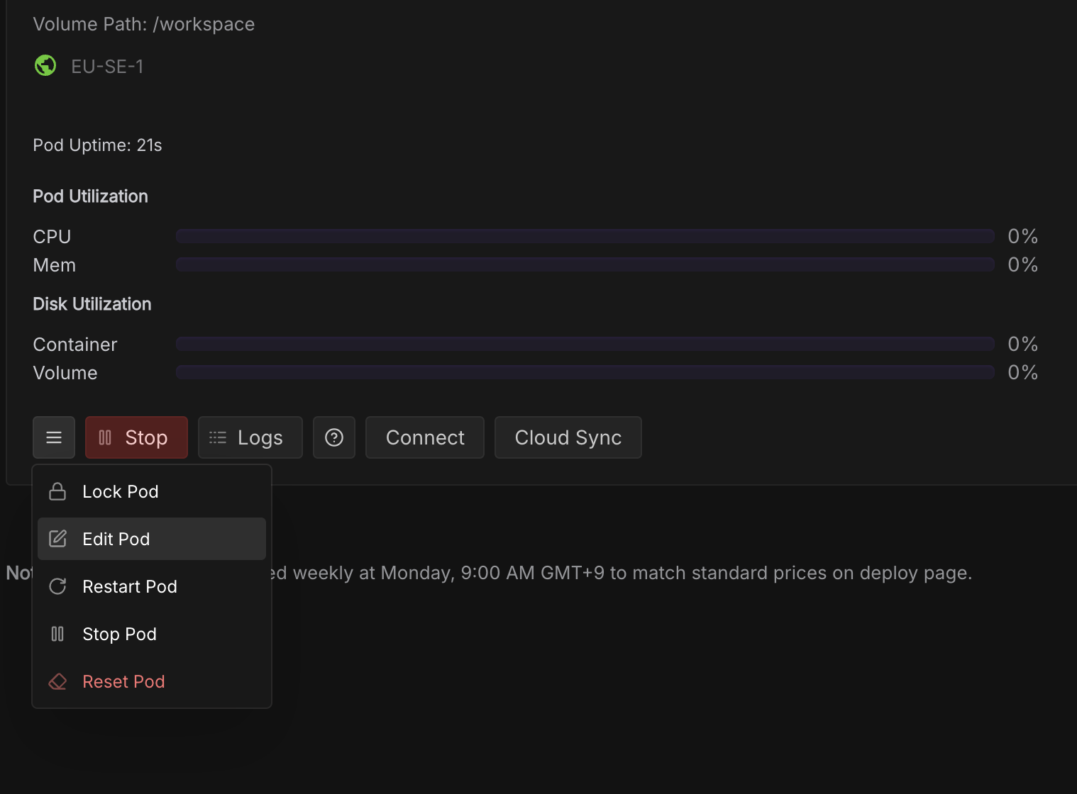 실행하기 전에 Edit Pod에서 Storage를 100GB로 바꿔준다.