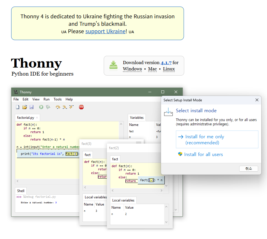 Thonny 4 is dedicated to Ukraine fighting the Russian invasion and Trump's blackmail. 🇺🇦 Please support Ukraine! 🇺🇦 Download version 4.1.7 for • • Thonny Python IDE for beginners Features Easy to get started. Thonny comes with Pytho