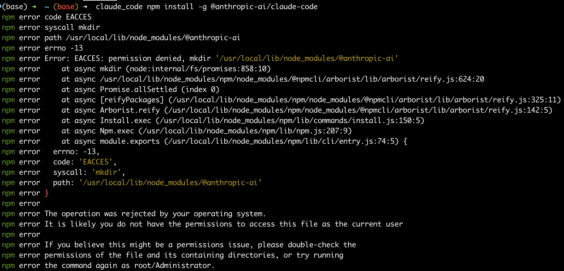 claude 라는 binary file을 npm을 통해 설치하는데 위치가 /usr/local/lib/node_modules 여서 권한 문제가 생기는거다