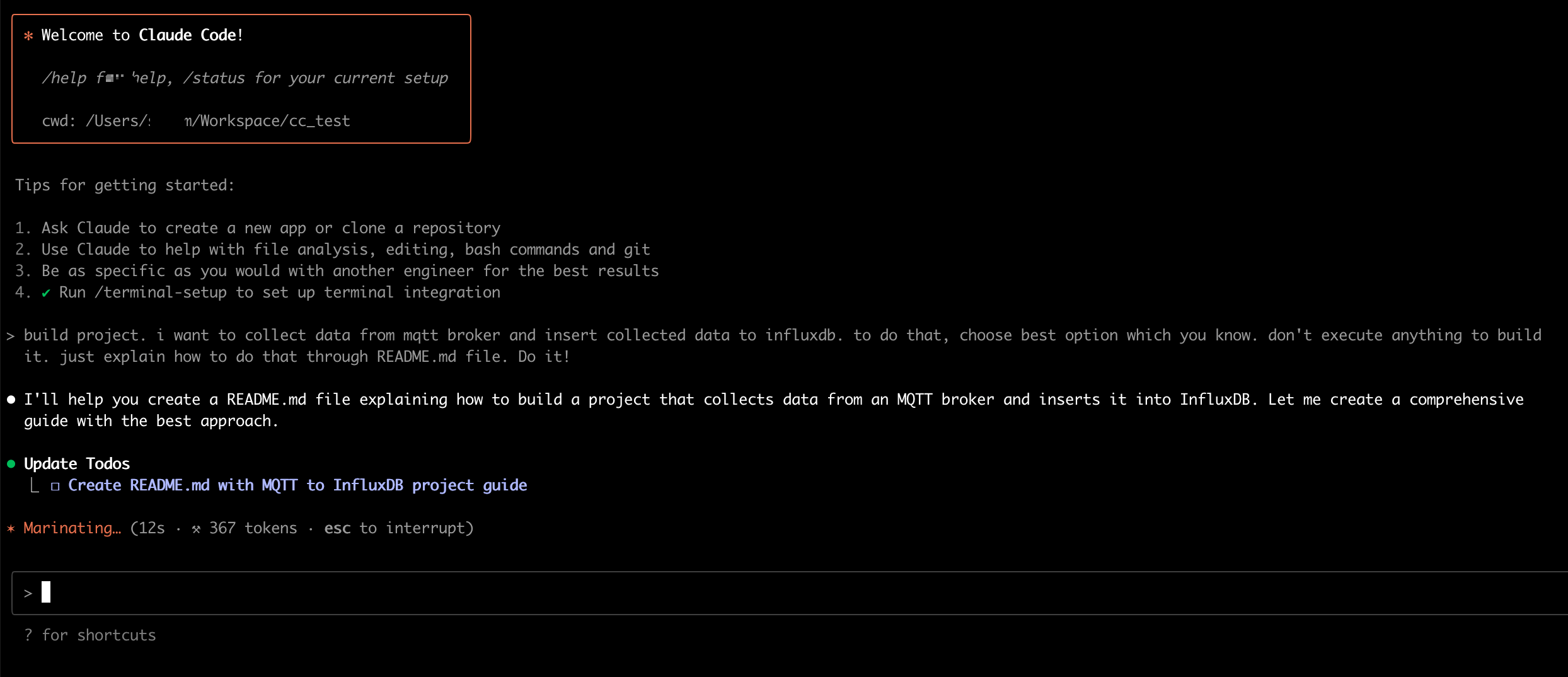 build project. i want to collect data from mqtt broker and insert collected data to influxdb. to do that, choose best option which you know. don't execute anything to build it. just explain how to do that through README.md file. Do it!